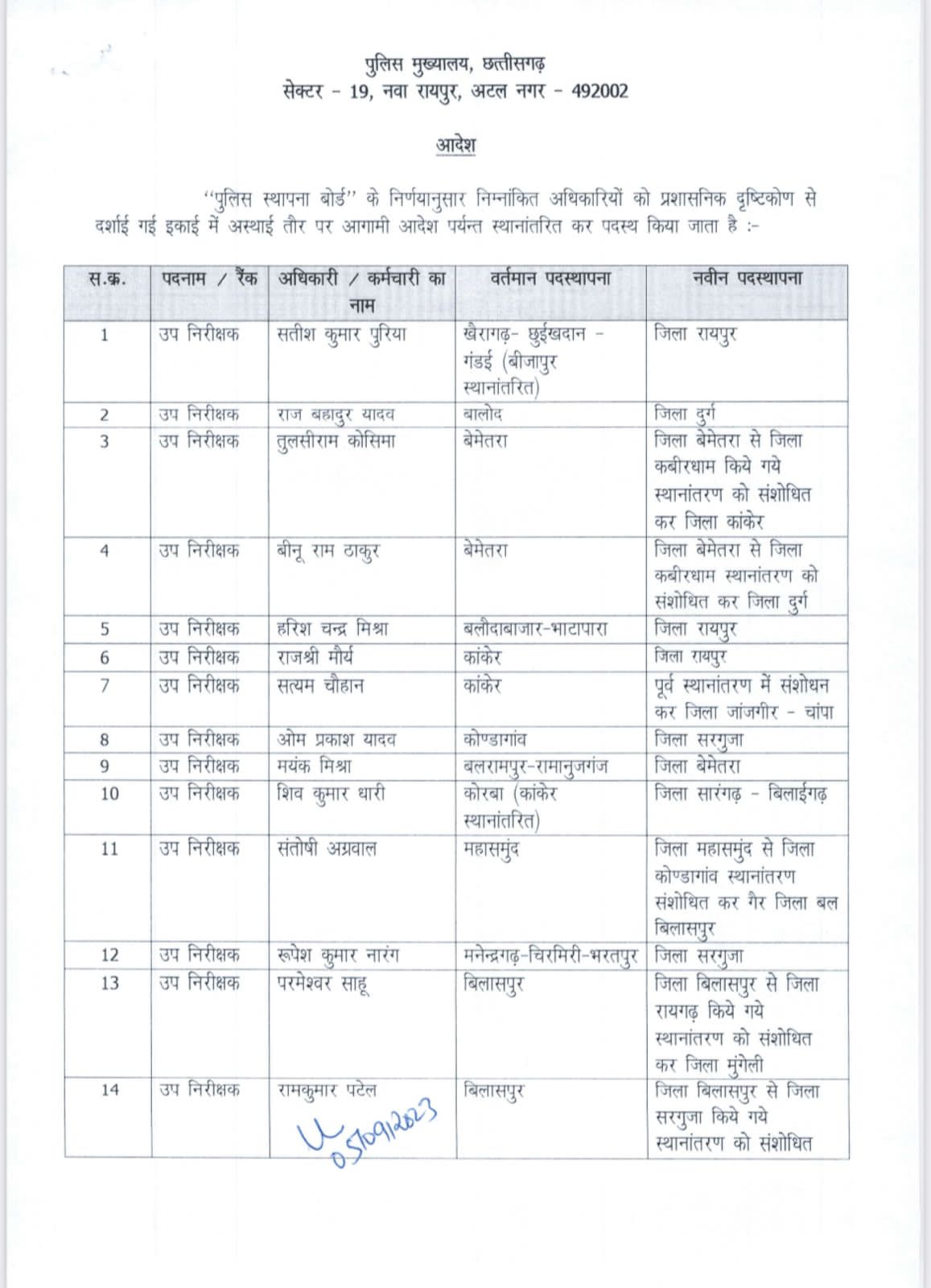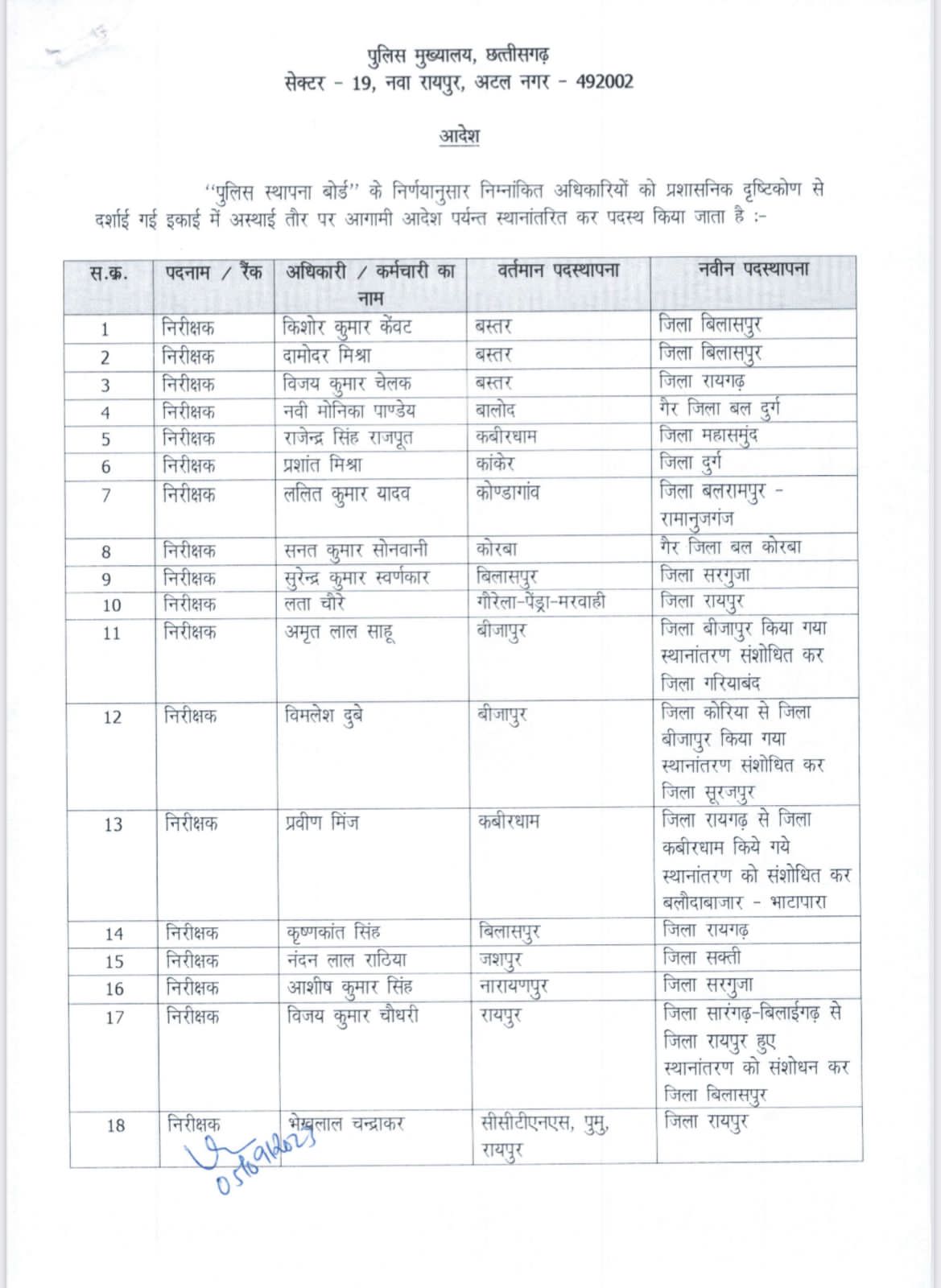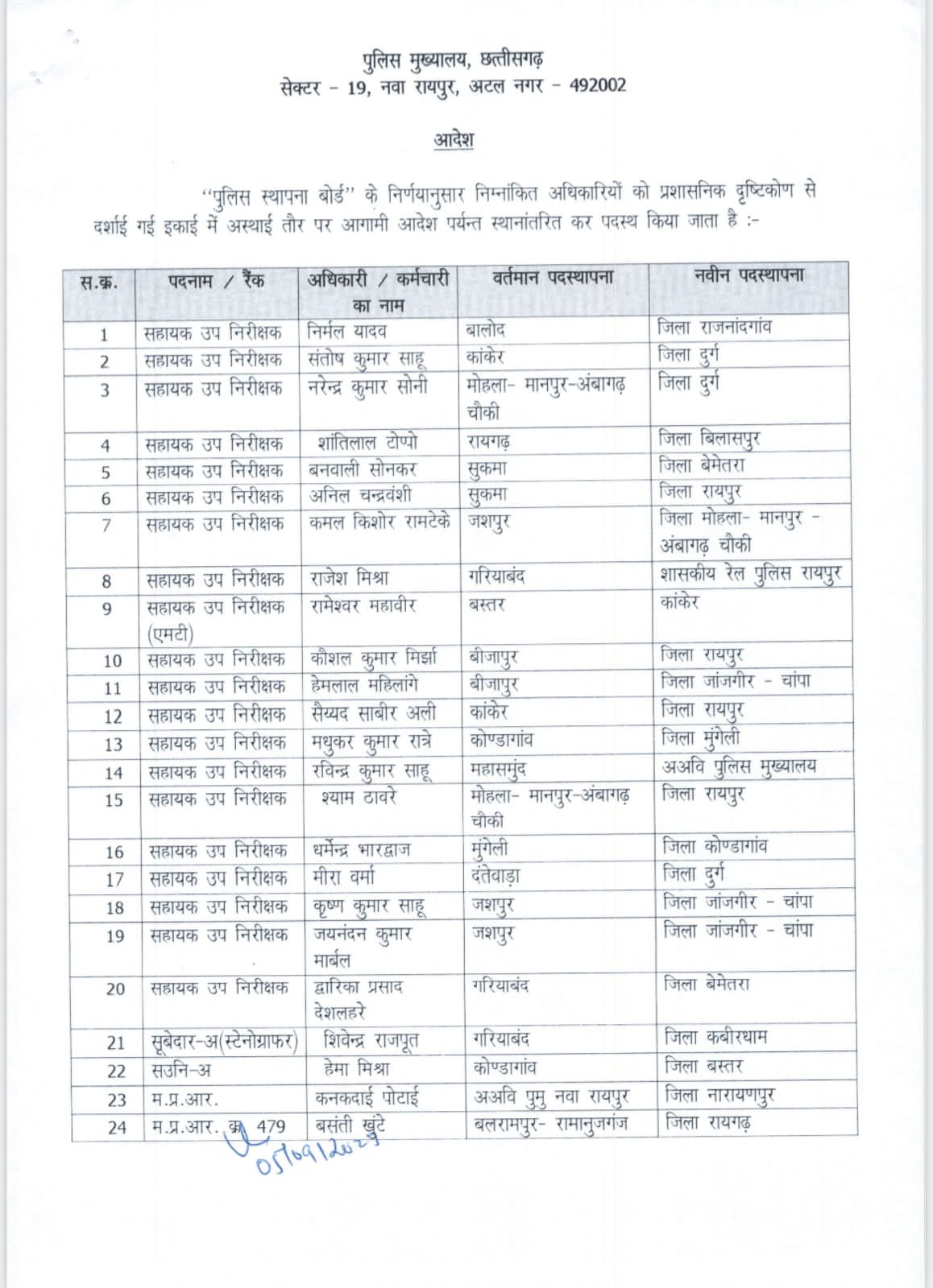 CG Police Transfer जारी आदेश के मुताबिक 25 थानेदार, 70 सब इंस्पेक्टर, 22 ASI इधर से उधर किए गए हैं. इसके साथ ही 28 हवलदार और 138 आरक्षकों का भी तबादला किया गया है.