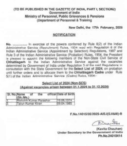 रायपुर। केंद्र सरकार के कार्मिक, लोक शिकायत एवं पेंशन मंत्रालय (कार्मिक एवं प्रशिक्षण विभाग) ने अधिसूचना जारी कर छत्तीसगढ़ के दो अलाइड सर्विस अधिकारियों को भारतीय प्रशासनिक सेवा (आईएएस) में नियुक्त किया है. यह नियुक्ति वर्ष 2024 की चयन सूची (नॉन-एससीएस) के अंतर्गत की गई है.