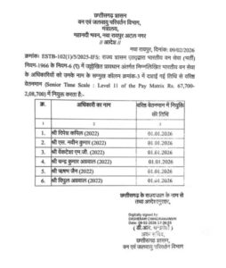 CG IFS Promotion News : रायपुर। राज्य सरकार के वन विभाग के द्वारा भारतीय वन सेवा के अधिकारियों को वरिष्ठ श्रेणी वेतनमान (seniour time scale:–level 11 of the pay matrix rs 67,700– 2,08,700) में पदोन्नति दी गई है। यह पदोन्नति भारतीय वन सेवा भर्ती नियम – 1966 के नियम –6(a) में उल्लेखित प्रावधान अंतर्गत की गई है।