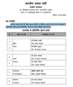 रायपुर। भारतीय जनता पार्टी की केंद्रीय चुनाव समिति ने 6 प्रदेशों में राज्यसभा चुनाव के लिए प्रत्याशियों की घोषणा कर दी है। BJP के राष्ट्रीय अध्यक्ष नितिन नवीन भी बिहार से राज्यसभा चुनाव लड़ेंगे। वहीं छत्तीसगढ़ से पार्टी ने लक्ष्मी वर्मा को अपना अधिकृत प्रत्याशी घोषित किया है।