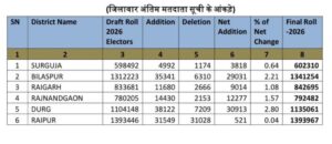 रायपुर। छत्तीसगढ़ में मतदाता सूची के विशेष संक्षिप्त पुनरीक्षण (एसआईआर) की प्रक्रिया पूरी हो गई है। इसके बाद राज्य की निर्वाचक नामावली का अंतिम प्रकाशन कर दिया गया है। इस प्रक्रिया में बड़े पैमाने पर फर्जी और संदिग्ध मतदाताओं के नाम हटाए गए हैं। मुख्य निर्वाचन पदाधिकारी यशवंत कुमार ने जानकारी देते हुए बताया कि एसआईआर अभियान के दौरान लगभग 24 लाख 99 हजार से अधिक मतदाताओं के नाम सूची से हटाए गए हैं। अब प्रदेश में कुल 1,87,30,914 मतदाता हैं। उन्होंने अभियान में सहयोग देने के लिए प्रदेशवासियों का आभार व्यक्त किया है।